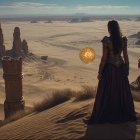 A figure in ornate armor stands on a desert ridge, holding a glowing staff. Majestic structures emerge in the distance, surrounded by vast sands under a dramatic sky, evoking a mystical atmosphere.