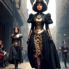 A fashionable figure in a striking black and red outfit walks confidently down a narrow street lined with buildings. She wears a dramatic hat and has a bold, stylish presence.