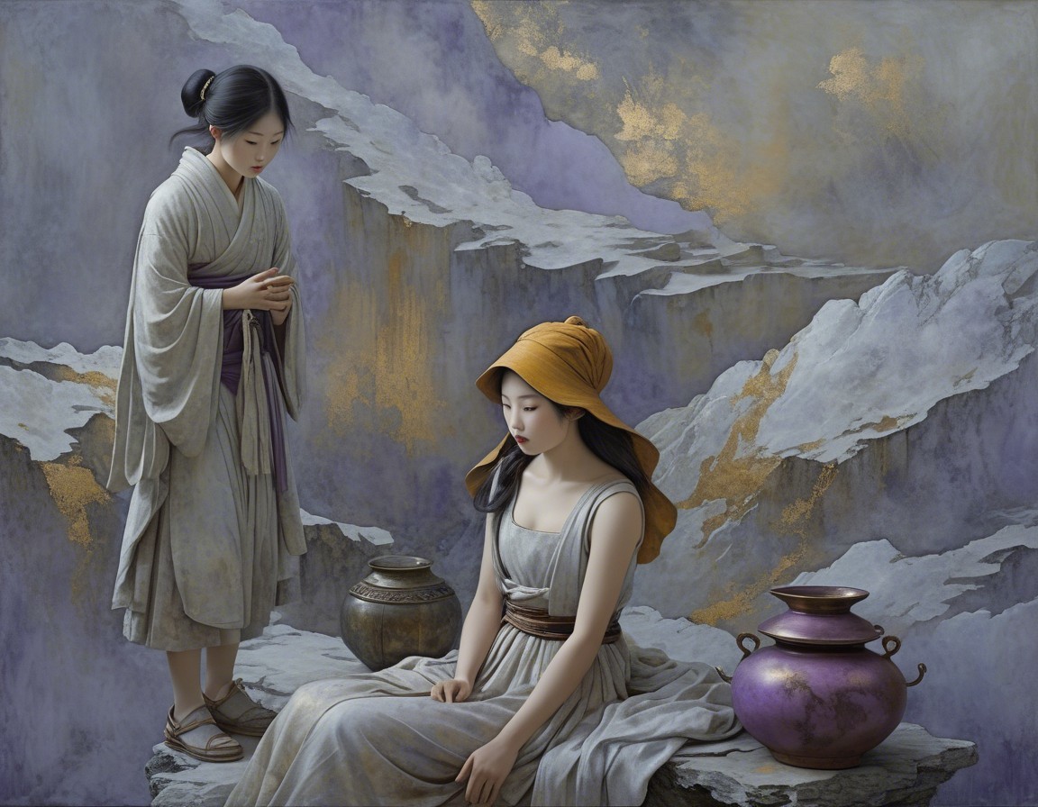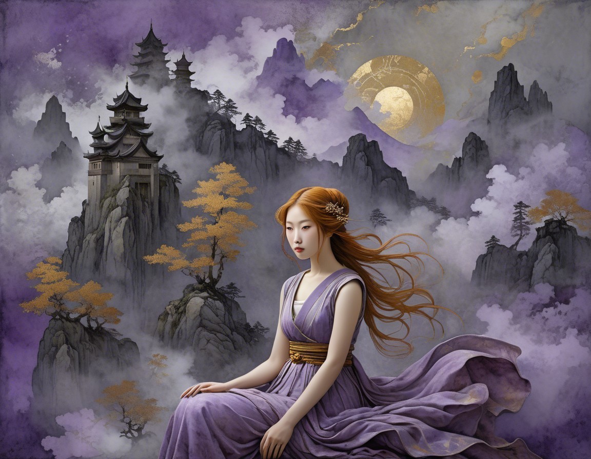Legend of the Girl and the phantom, Medieval Japanese Artists Sumi-e Style, Velvet blush purple, Shabby, Dull Gold, Amber Gray, marbled. dramatic
