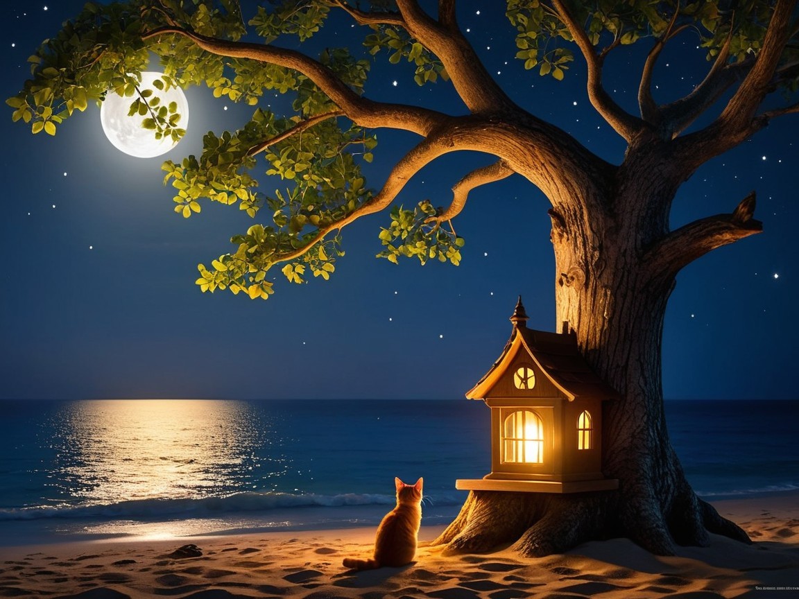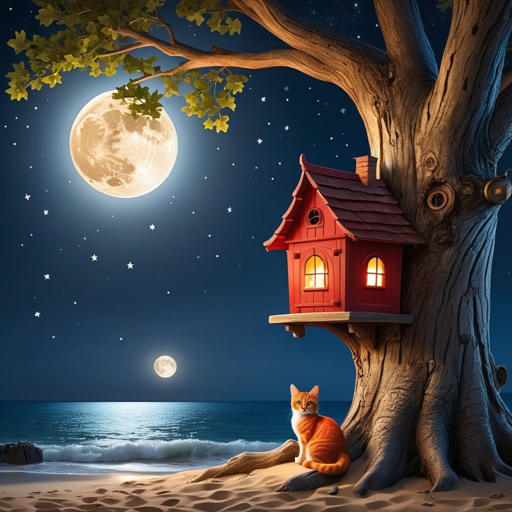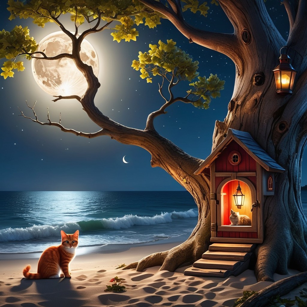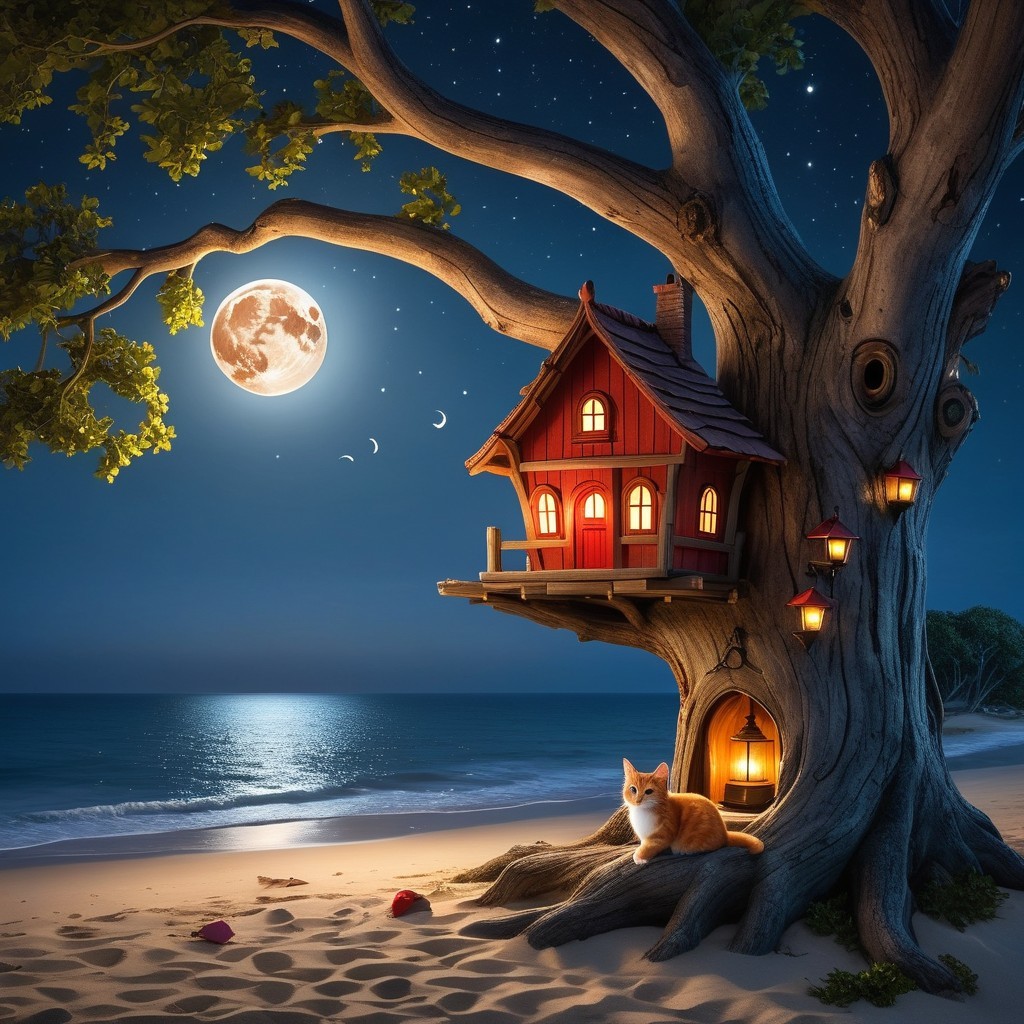 A whimsical treehouse nestled in a large tree by the beach, illuminated by lanterns. A serene moonlit night sets the scene, with an orange cat sitting on the sandy shore, gazing curiously.