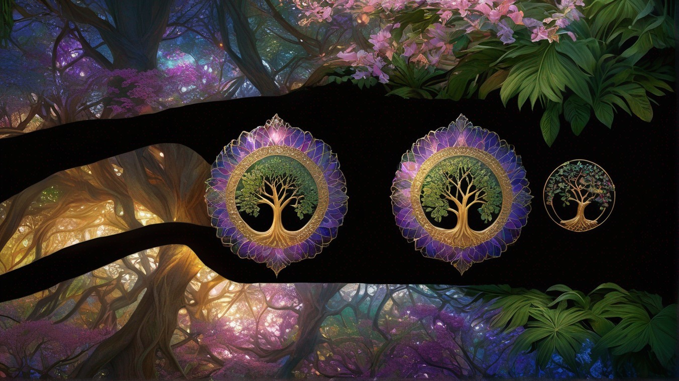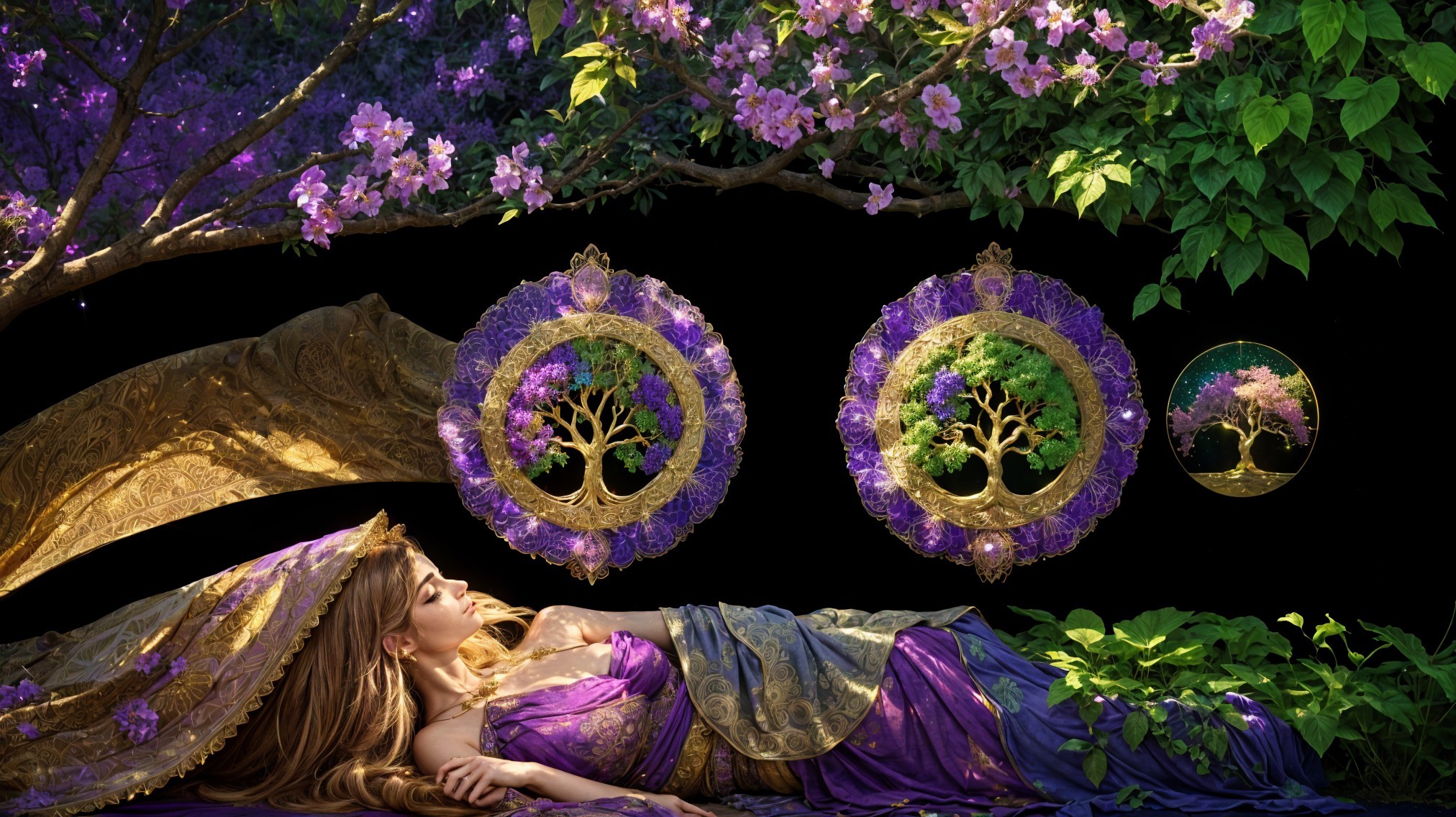 Majestic Tree of Life, mystical garden setting, vibrant ornamental leaves, enigmatic bark pattern, woman in ethereal attire, peaceful demeanor, exotic plants, lush flowers, soft mysterious luminosity, magical ambiance, fantasy digital art, intricate details, warm and soft color palette, dappled sunlight filtering through leaves, by Stephanie Law, high-resolution, Artstation.