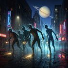 In a neon-lit cityscape, ethereal figures with glowing blue skin run dramatically through the streets, surrounded by tall buildings and a prominent view of Saturn in the night sky.