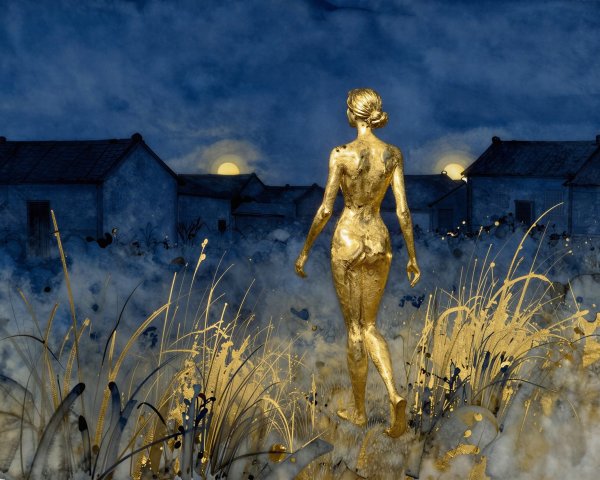 A striking portrait of a woman with intricate hair resembling branches, set against an ethereal backdrop. The moon peeks through, adding a mystical ambiance to the composition.
