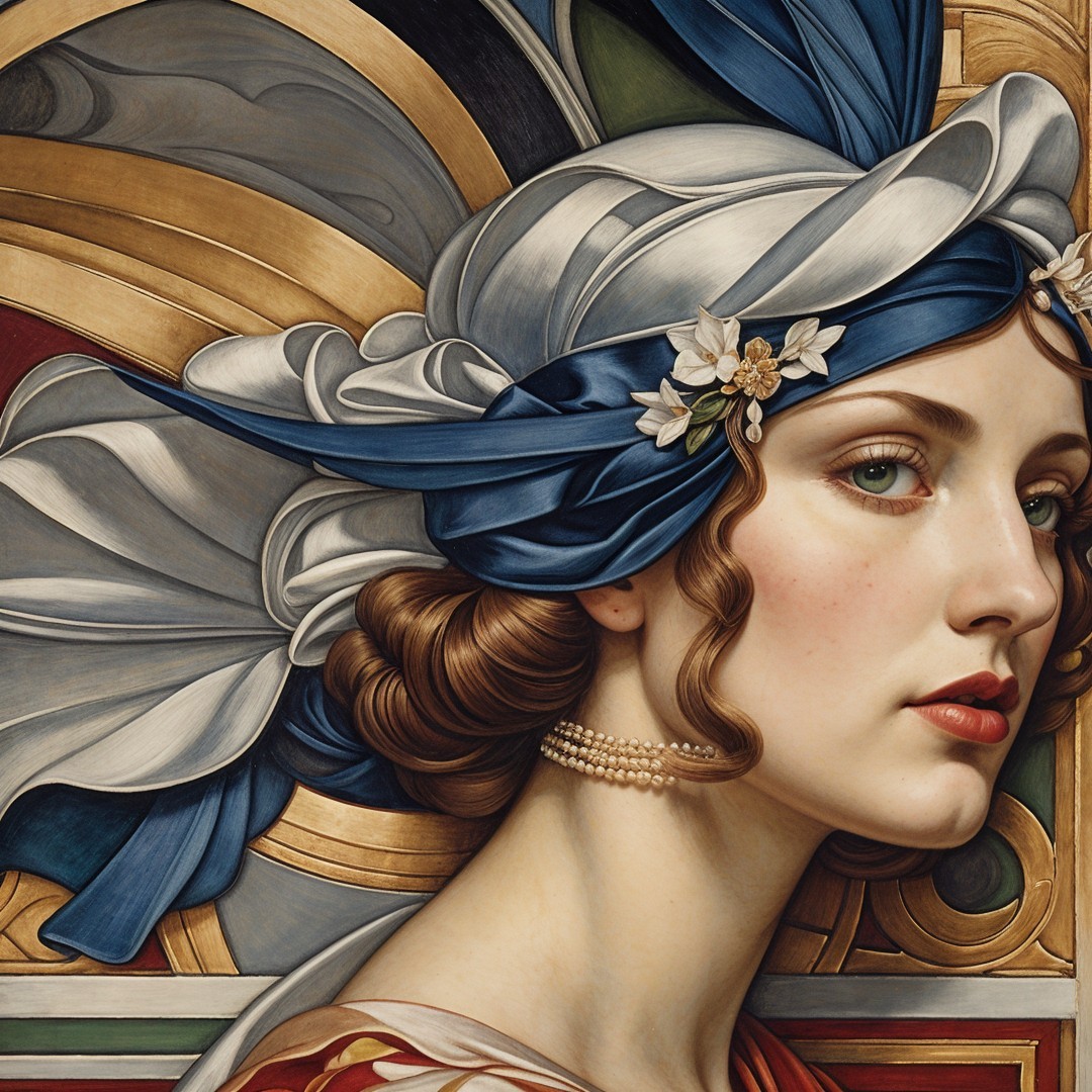 The image features a stylized portrait of a woman with flowing hair adorned with a blue and white headscarf. Her expressive features and elegant design evoke a sense of grace and sophistication.