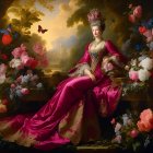 A regal woman in a flowing red gown sits among vibrant flowers in a sunlit forest. Butterflies flutter around her, enhancing the enchanting atmosphere of this magical scene.