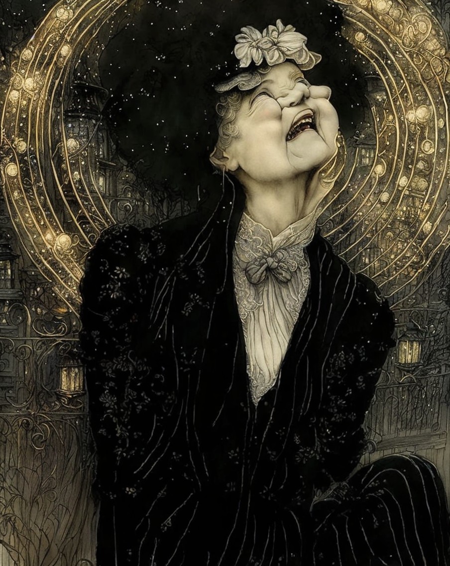 The image features a joyful older woman in a large black hat and elegant dark attire, surrounded by glowing orbs of light, exuding warmth and charm in a picturesque outdoor setting.