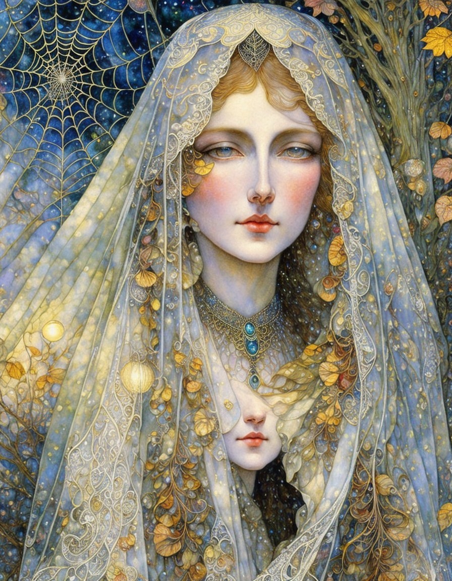 A young woman with long, flowing red hair wears a delicate lace veil and an elegant dress. She gazes thoughtfully, set against a backdrop of a moonlit city and intricate spiderwebs.