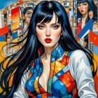The image features a striking woman with dark hair, styled in a colorful geometric outfit. The vibrant background is filled with shapes and patterns, creating a dynamic and artistic atmosphere.