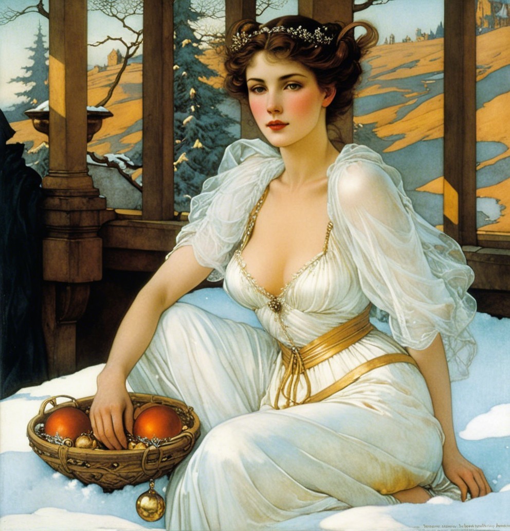 A serene woman in a white, elegant outfit adorned with a fur cape sits in the snow, holding a bowl of red ornaments. A picturesque village and trees frame the winter scene.