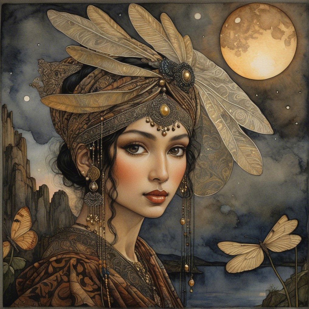 + Prompt:Romanian gypsy Black goddess, glorious dramatic sunset, healing soul. Paisley pattern. elegant fantasy intricate very attractive beautiful award winning fantastic view hyperrealistic ultra detailed high definition crisp quality watercolor Arthur Rackham Gustav Klimt pen and ink Johannes Vermeer Rebecca Guay Michael Parkes Wide open eyes Ella du Cane beautiful elegant intricate fantasy very attractive