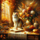A serene autumn scene features a fluffy orange-and-white cat sitting on a wooden table, surrounded by vibrant flowers, oranges, candles, and open books, with warm sunlight streaming through a window.