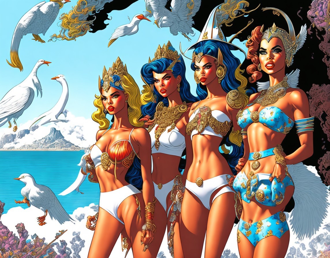 Three bunnies amidst colorful Easter eggs and flowers with a serene ocean backdrop and floating pink blossoms.