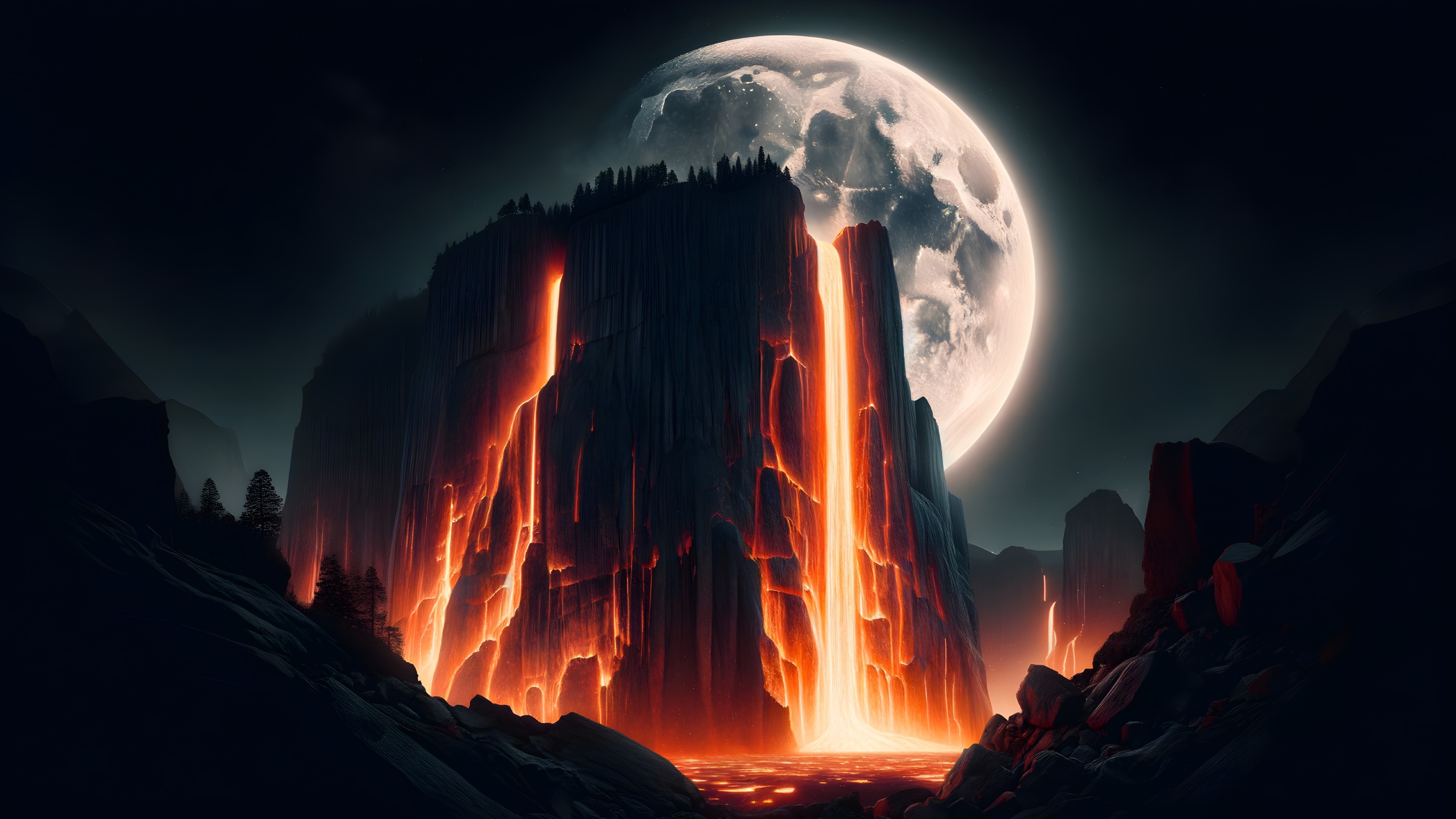 A majestic rock formation towers under a luminous full moon, illuminating a dramatic waterfall of molten lava cascading down its rugged face. Fiery orange and red hues contrast with serene moonlight, while silhouetted trees add depth to this surreal landscape.