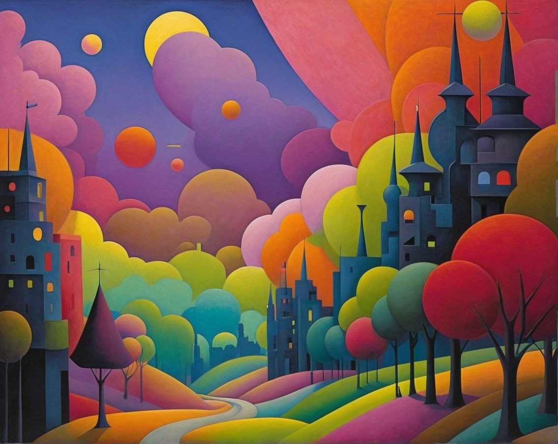 A vibrant, abstract landscape featuring whimsical castles, colorful trees, and rolling hills, all set against a surreal sky with bold colors and playful shapes. A dreamlike, enchanting scene.