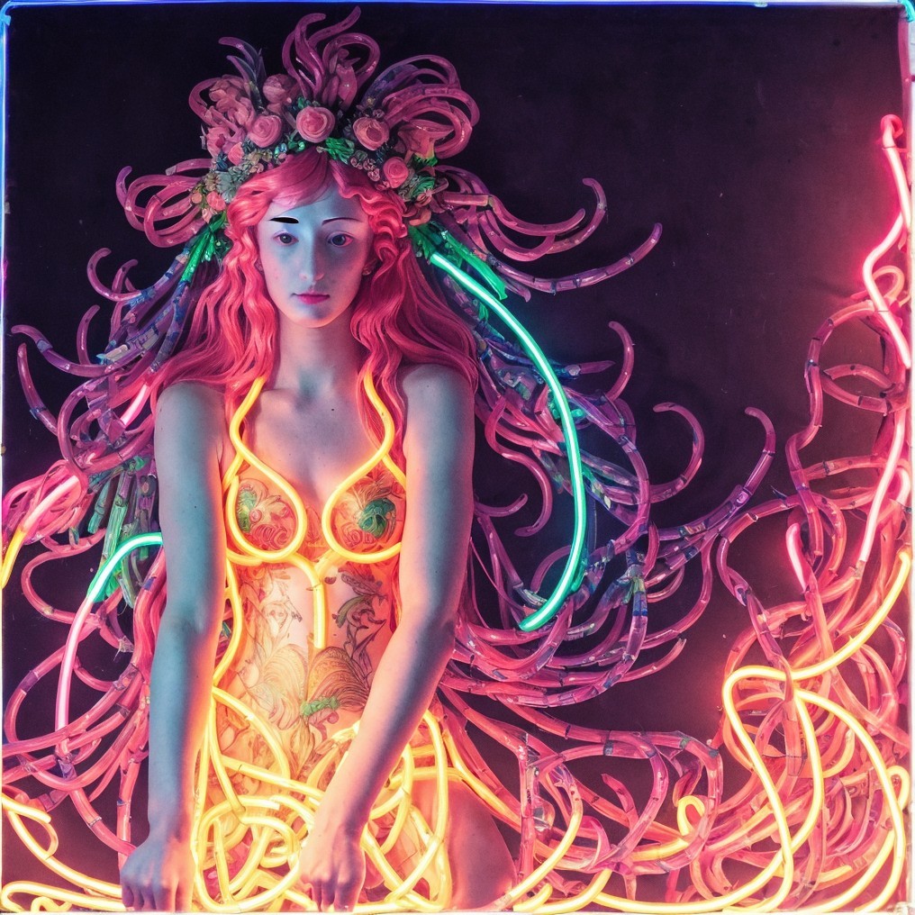 The image features a mystical figure with long, flowing hair adorned with flowers. Vibrant neon lights surround her, creating a captivating atmosphere of warmth and energy.