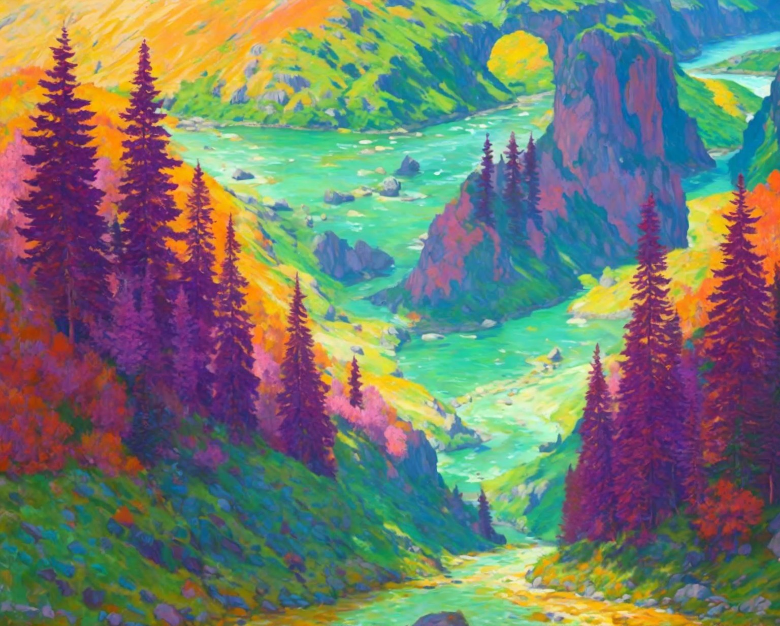 A vibrant, colorful landscape showcasing a meandering river with vividly hued pink and orange trees alongside rocky outcrops.