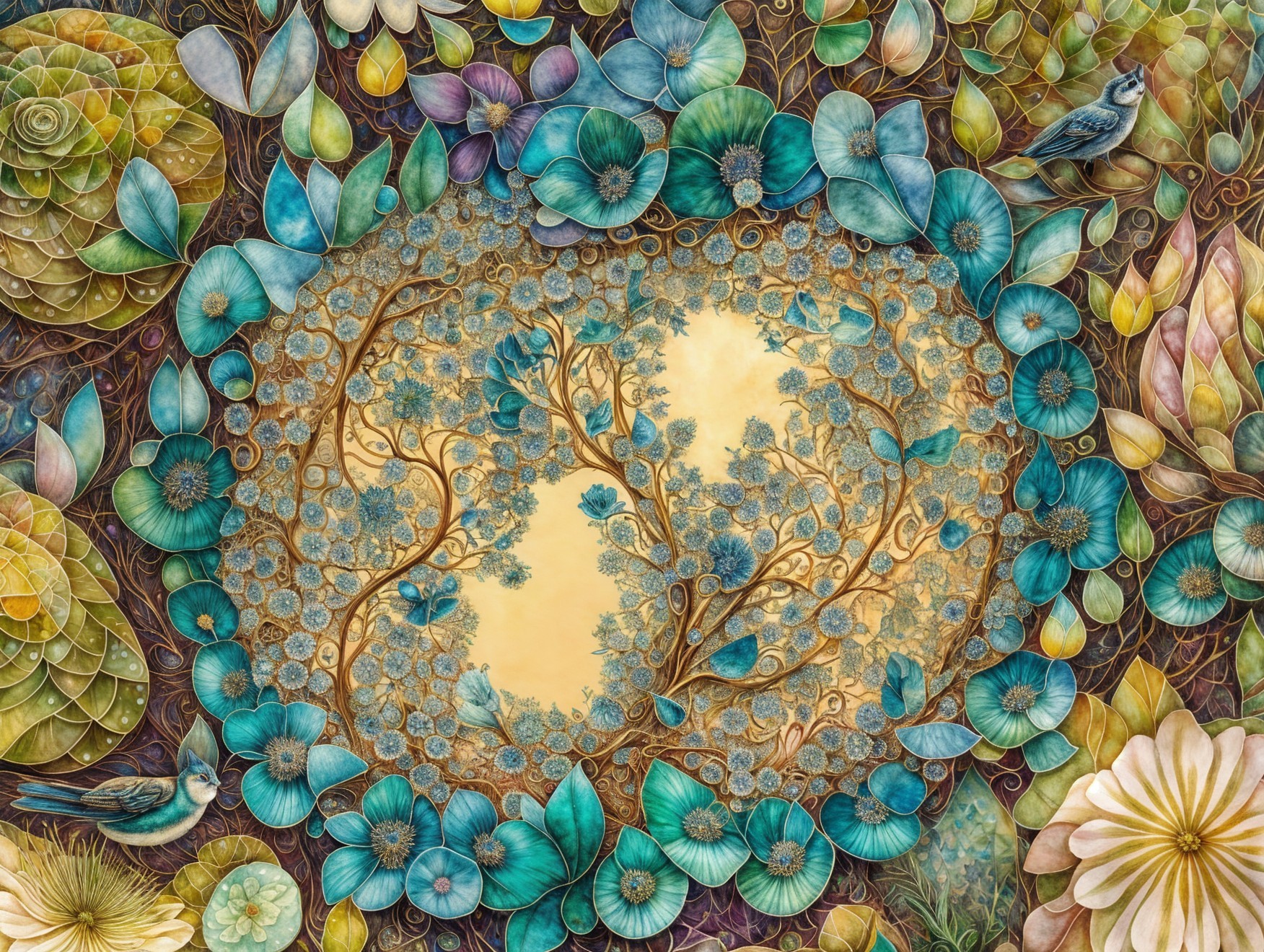 a whimsical cat sits amidst a vibrant, lush garden filled with colorful flowers, butterflies, and birds, all framed by intertwining foliage in a circular design.