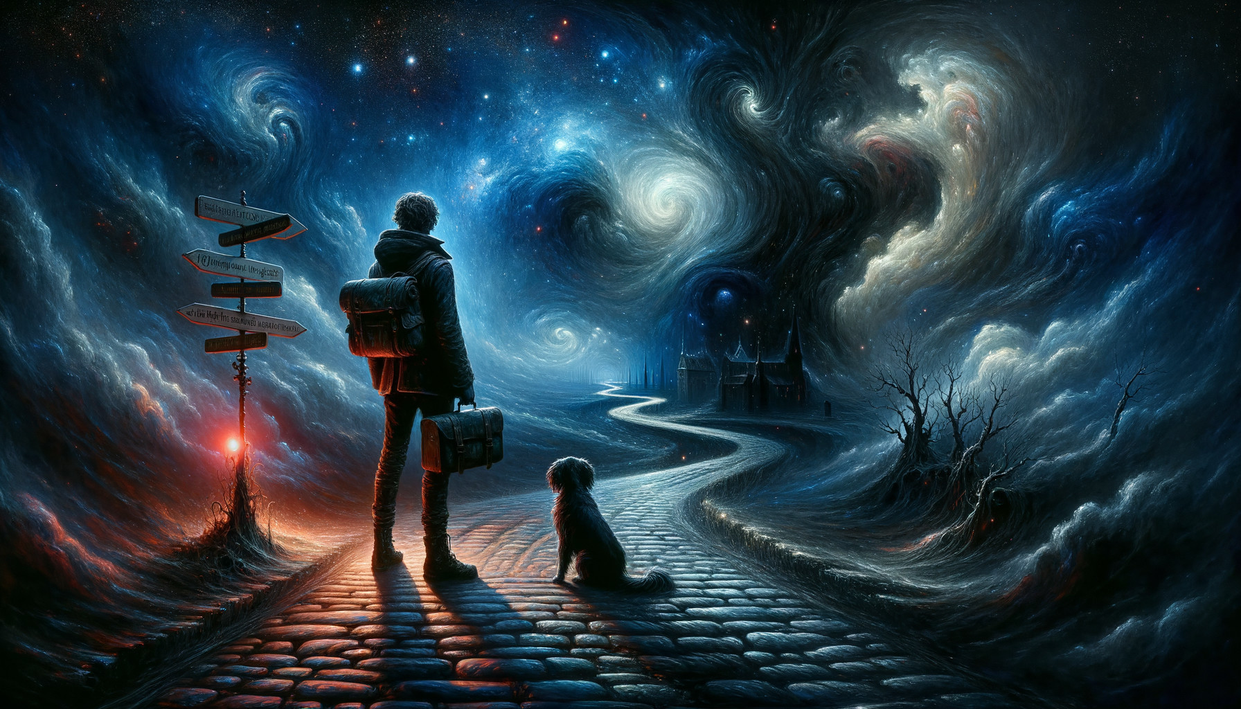 Prompt: Lonely traveller standing at the crossroads of time... dark background with stars and dramatic clouds... largely blues and blacks shades... one red light... road sign on an ancient post... cobbled paths leading into the distance... high contrast shadows... artgerm... hieronymus bosch... salvador dali