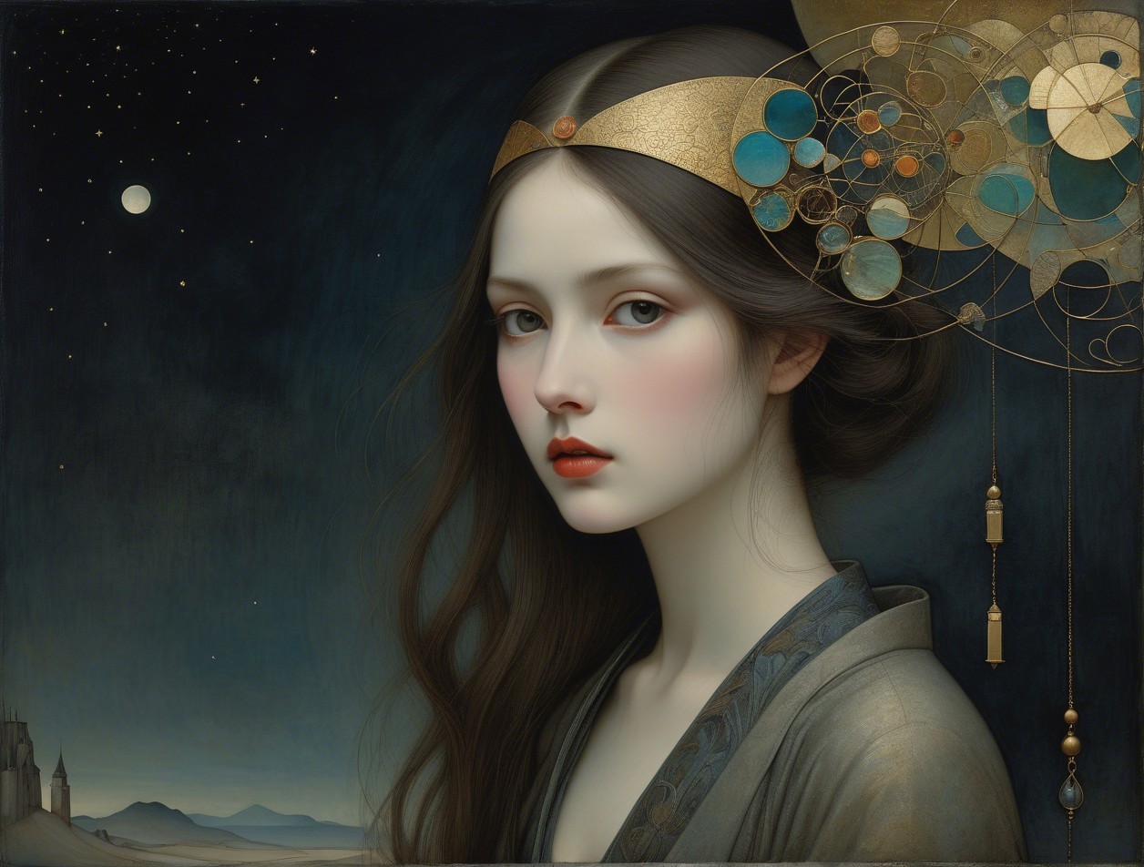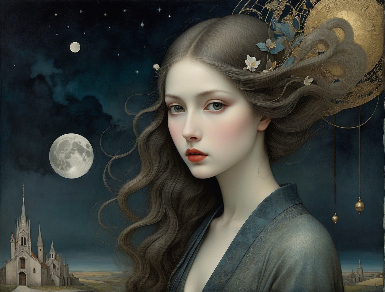 A painting of a woman sitting at a table with an orange drink, looking out over a city at night. The woman has red hair, pale skin, red lips, and pink cheeks. She is wearing a black dress with a white collar and cuffs, and a gold necklace. She is resting her