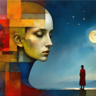 A surreal scene blending abstract faces and a contemplative figure in a red coat. Bright colors contrast with a moonlit sky, creating a dreamlike atmosphere of introspection and wonder.