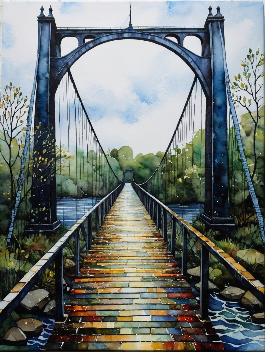 A vibrant watercolor painting of a suspension bridge, stretching over a rocky riverbed, with a pathway of colorful tiles leading towards lush green hills in the background.