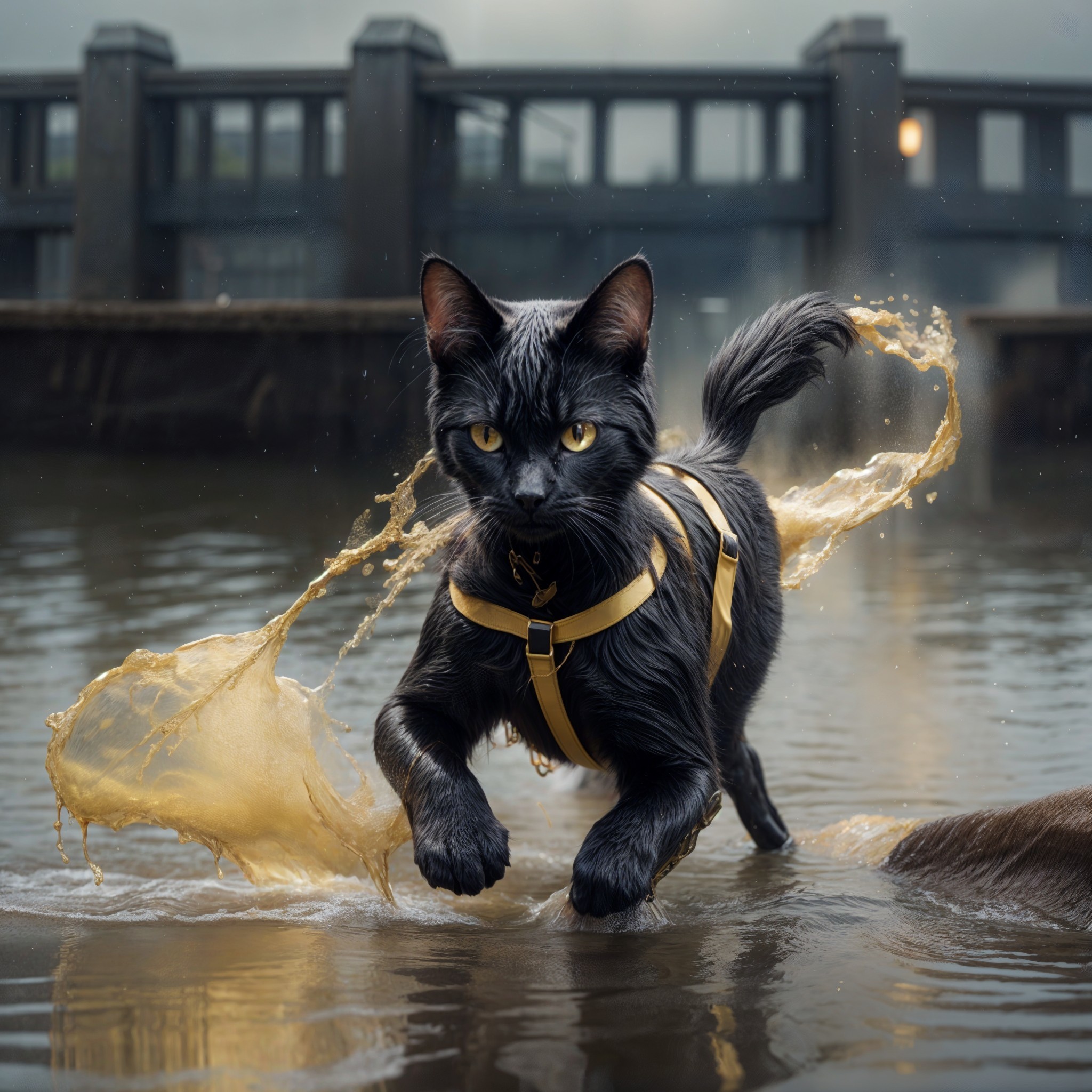 A sleek black cat in a yellow harness splashes through muddy water, its fur glistening. Surrounded by greenery and a blurred bridge in the background, it exudes confidence and playfulness.