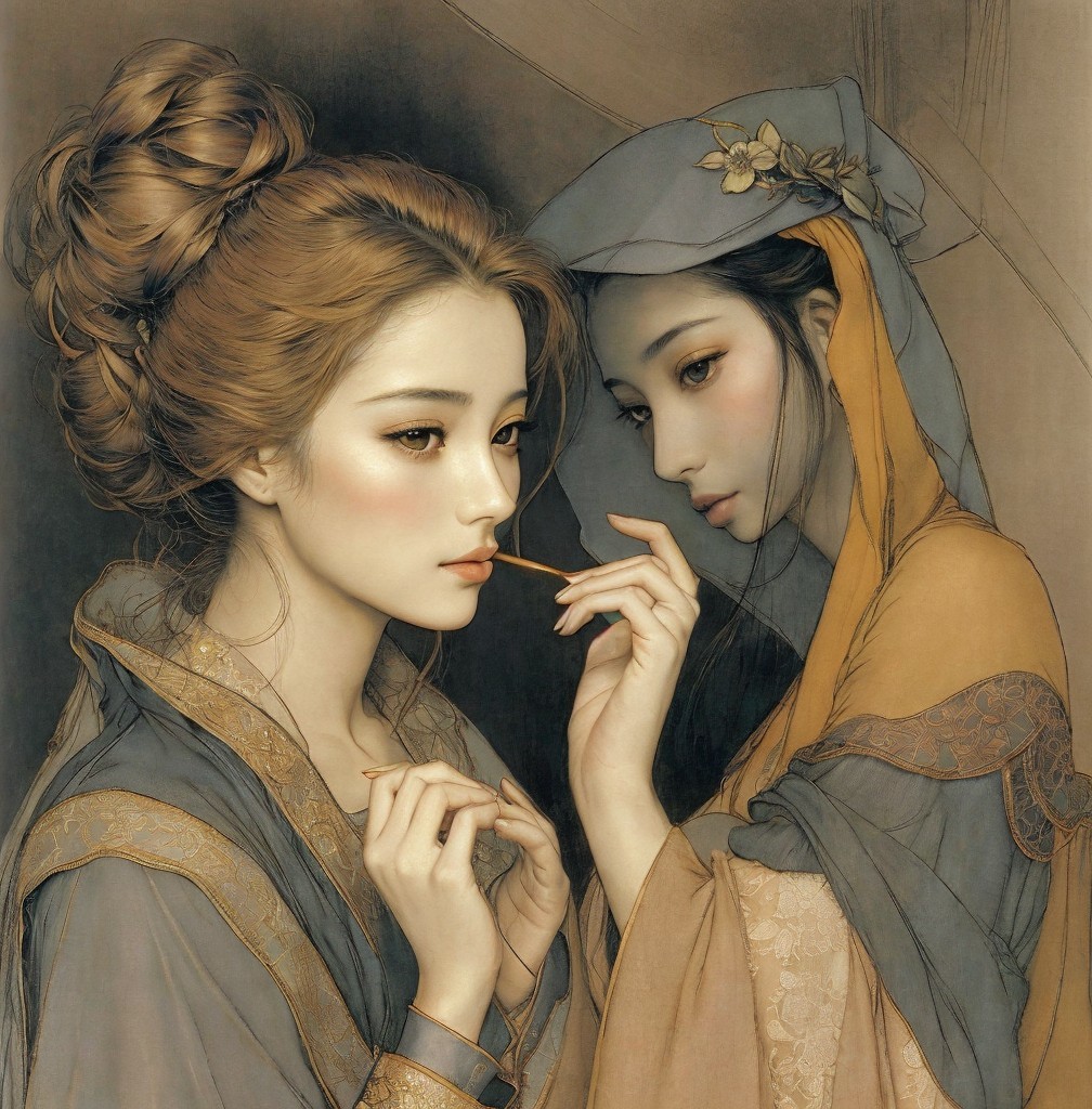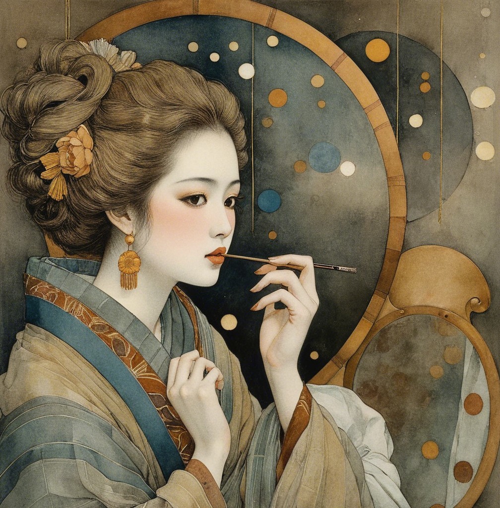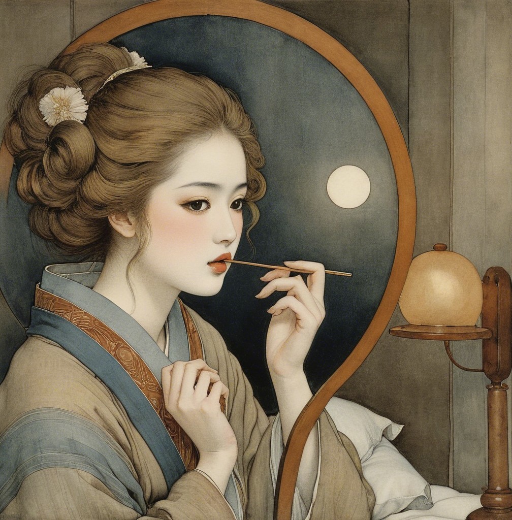 A young woman with soft features sits in a serene setting, holding a wooden stick to her lips. Dressed in a traditional garment, she gazes thoughtfully at a blank wooden board.