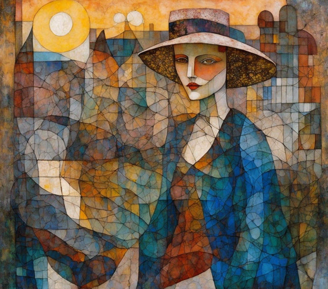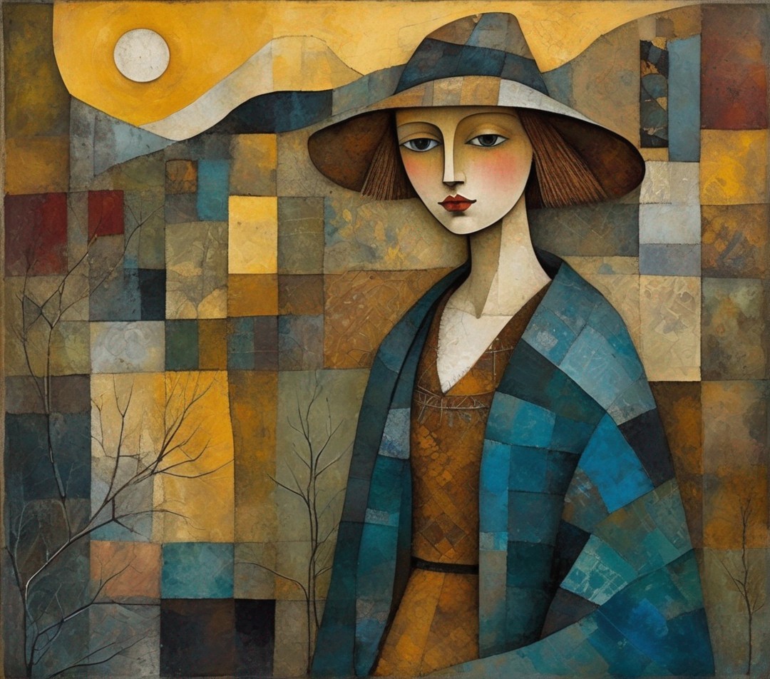 A cubist-style painting featuring a woman with geometric shapes, earthy tones, a house, and a moon in the background.