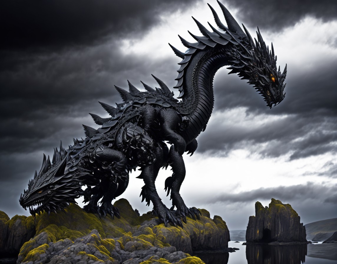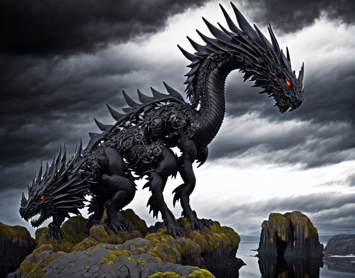 An imposing black, two-headed dragon stands on a rocky landscape under a stormy sky, with sharp scales and menacing red eyes.