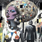 The artwork features three stylized figures with contrasting headgear, set against a colorful background. The central figure stands out, adorned with vibrant jewelry and a unique headdress.
