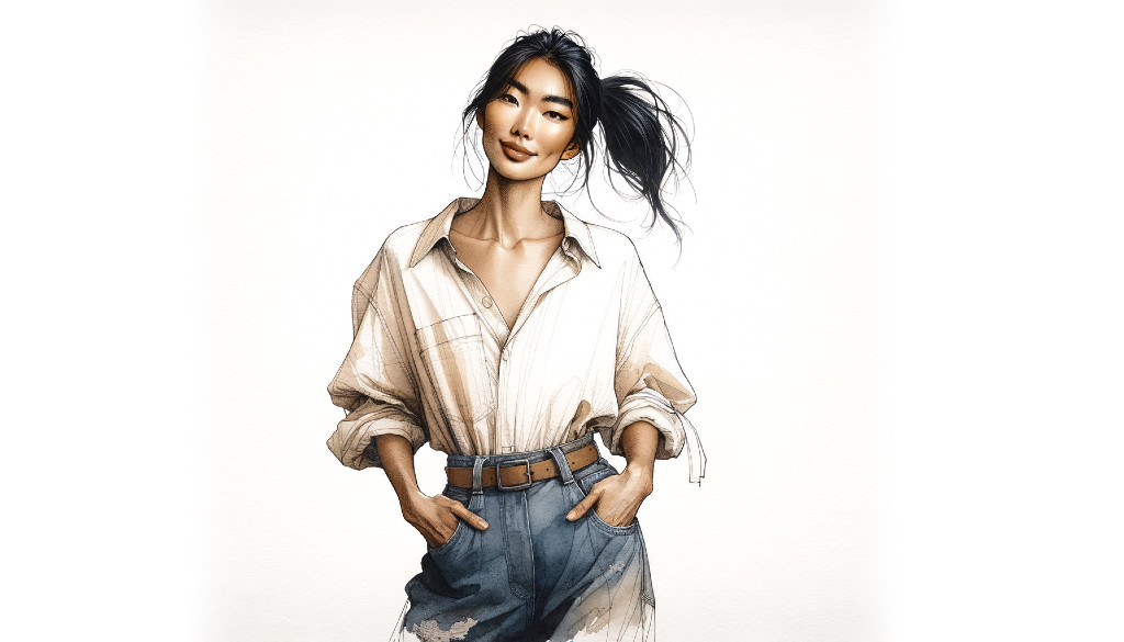 A woman with windblown hair wears a beige shirt, blue jeans, and a brown belt, posing against a white background.