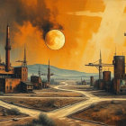A desolate landscape features crumbling buildings and towering structures, set against a dramatic orange sky with a large sun. The scene conveys a sense of dystopia and abandonment.