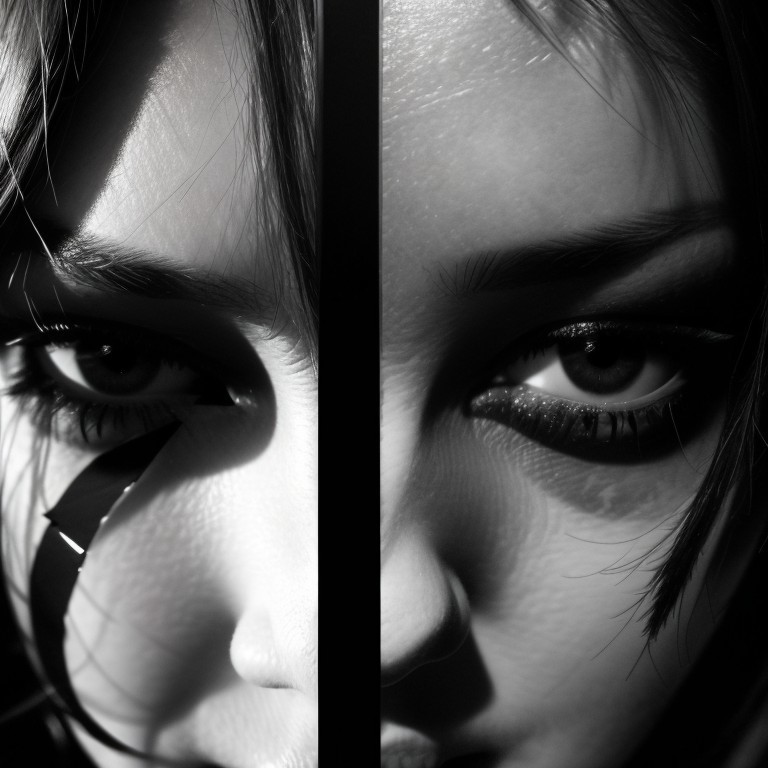 noir, face, blade, woman's face, sad eyes, Tight close-up, HDR, detail, sad, scissors, noir, film noir, mystery, dark shadows, black and white