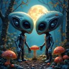 The image features two stylized figures with smooth, blue faces and unique headdresses, facing each other. They are surrounded by abstract shapes and a warm, glowing sun, with a small bird between them.
