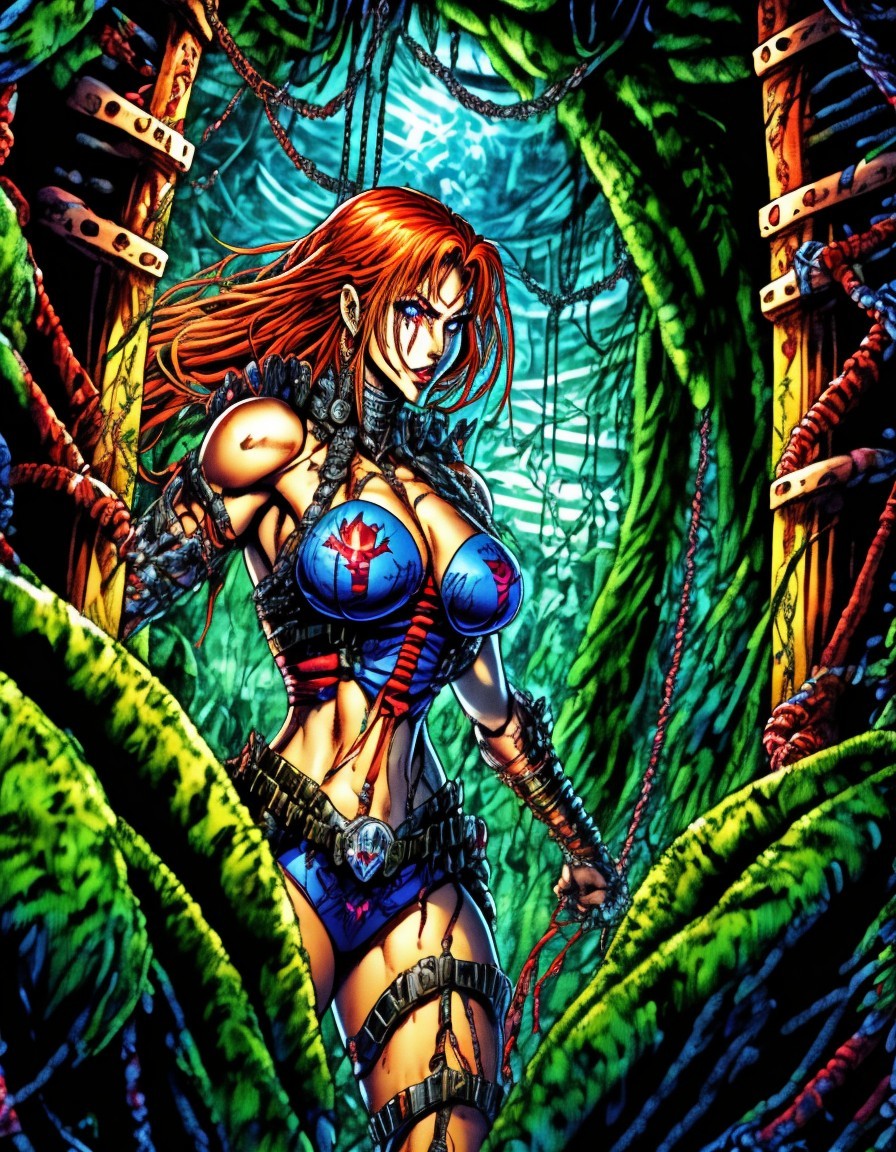 A colorful illustration of a red-haired woman in a futuristic armor standing in a vibrant jungle setting.