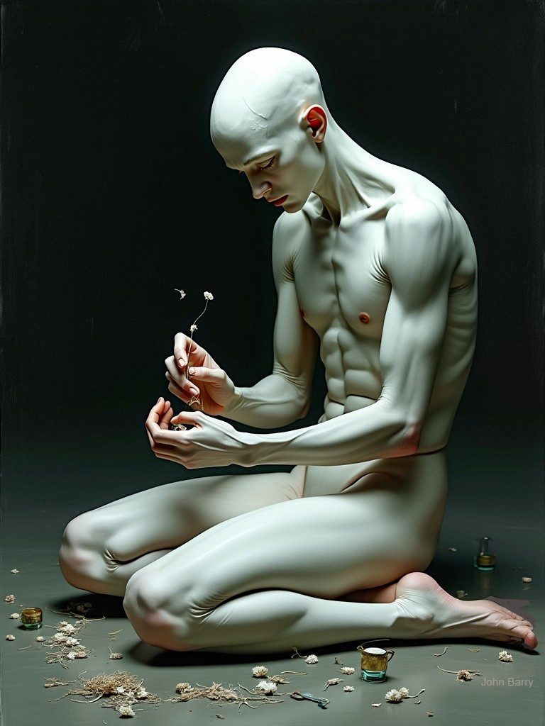 A pale, androgynous figure kneels on the floor, delicately holding small flowers and tools. The scene combines elements of fragility and strength against a dark background.