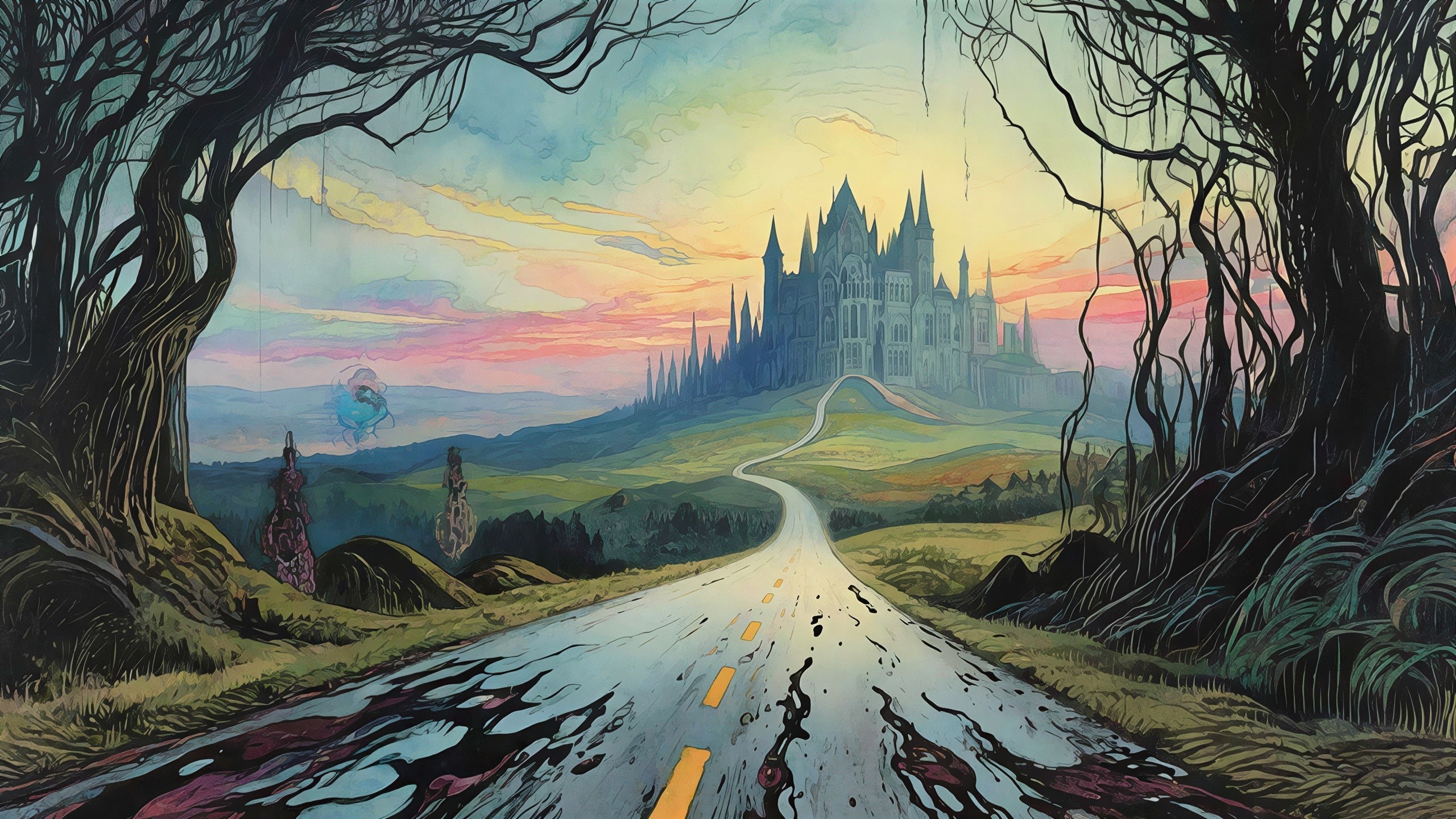 A captivating blend of surrealism and horror, this artwork features dynamic lighting and vibrant colors. It evokes existential themes through a fantastical landscape, merging the eerie with the epic.