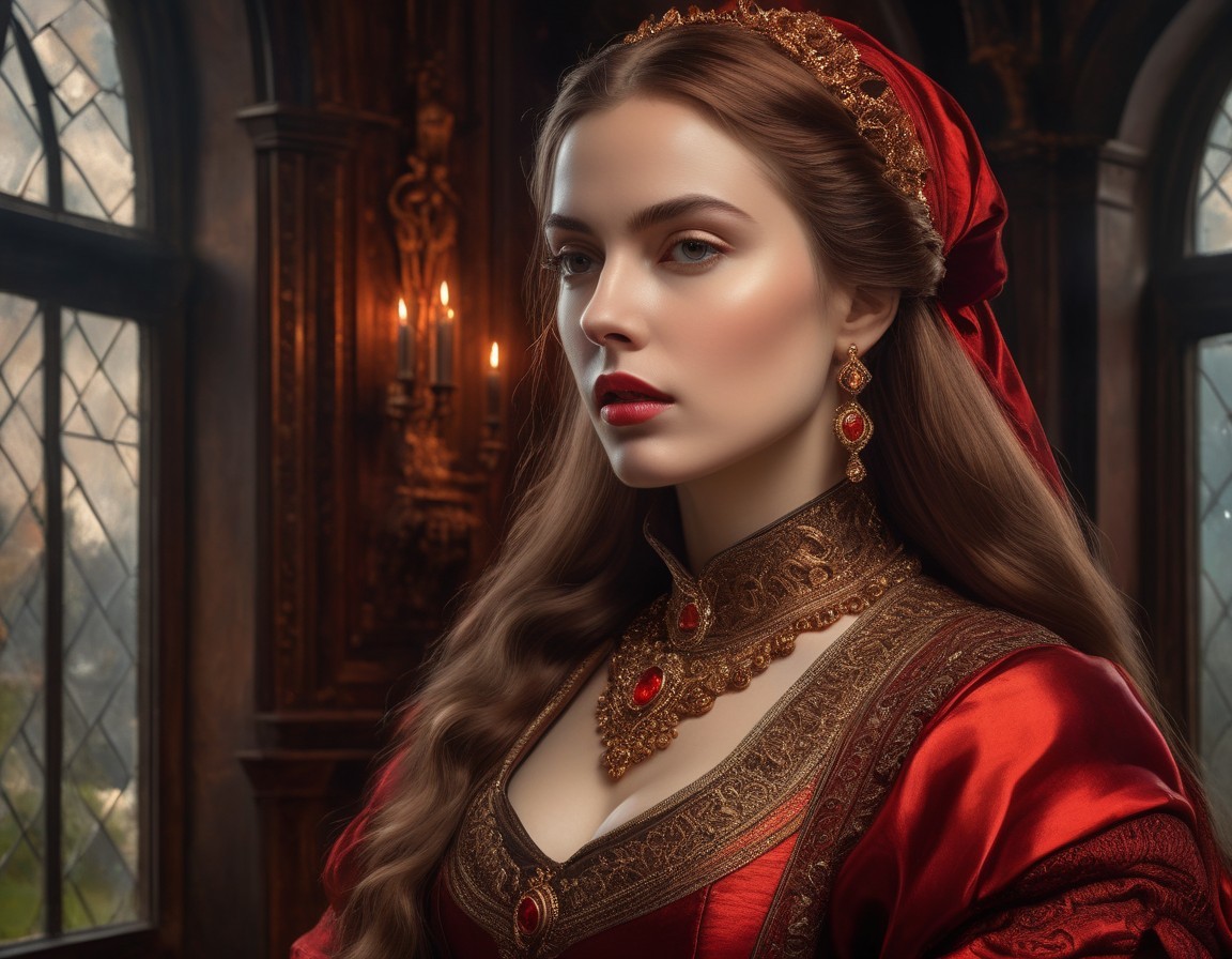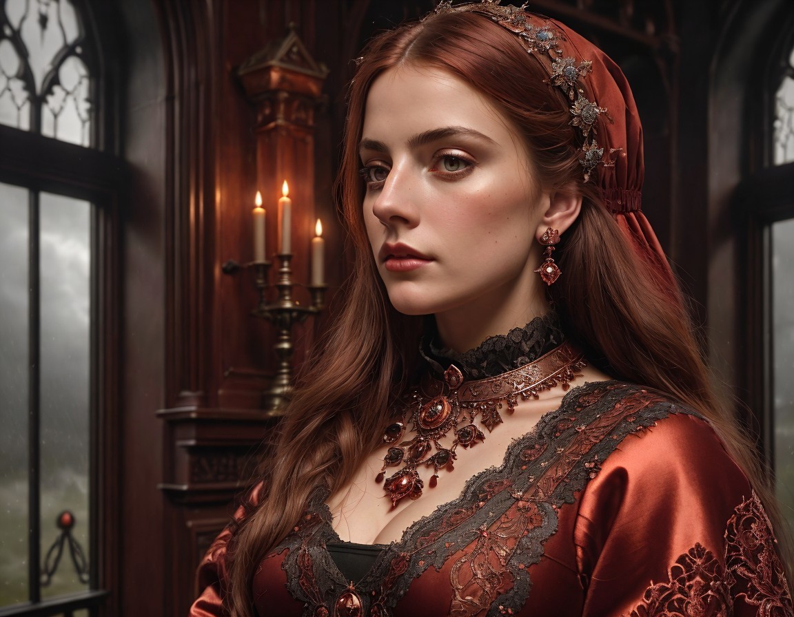 A woman in a Victorian gown with intricate lace details, a choker, and a jeweled headband stands in a gothic interior with lit candles.