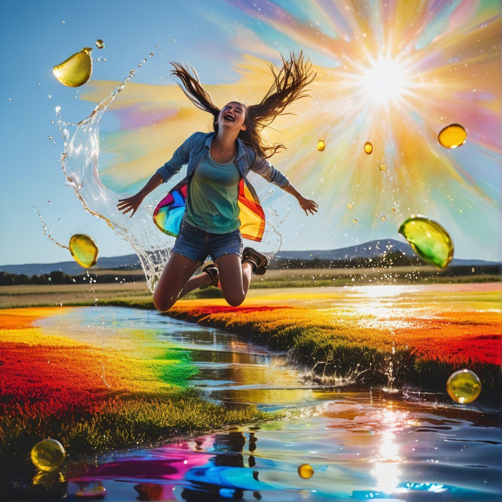 A joyful girl jumps through vibrant, rainbow-colored water, with colorful splashes and a shining sun in the background, embodying a fun and carefree summer day.