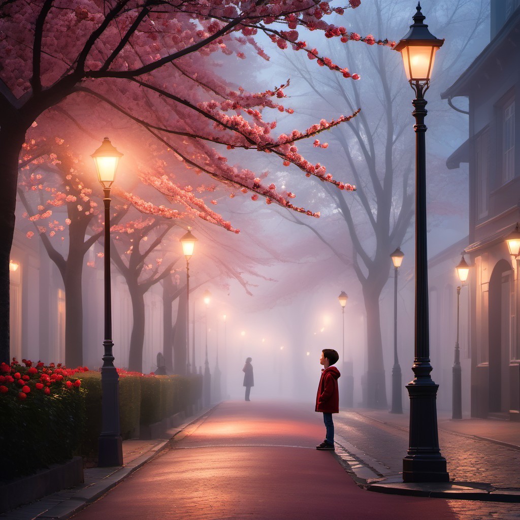 A serene, misty street lined with glowing street lamps and autumn trees. A solitary figure walks down the path, enveloped in a calm, ethereal atmosphere, evoking a sense of solitude and reflection.
