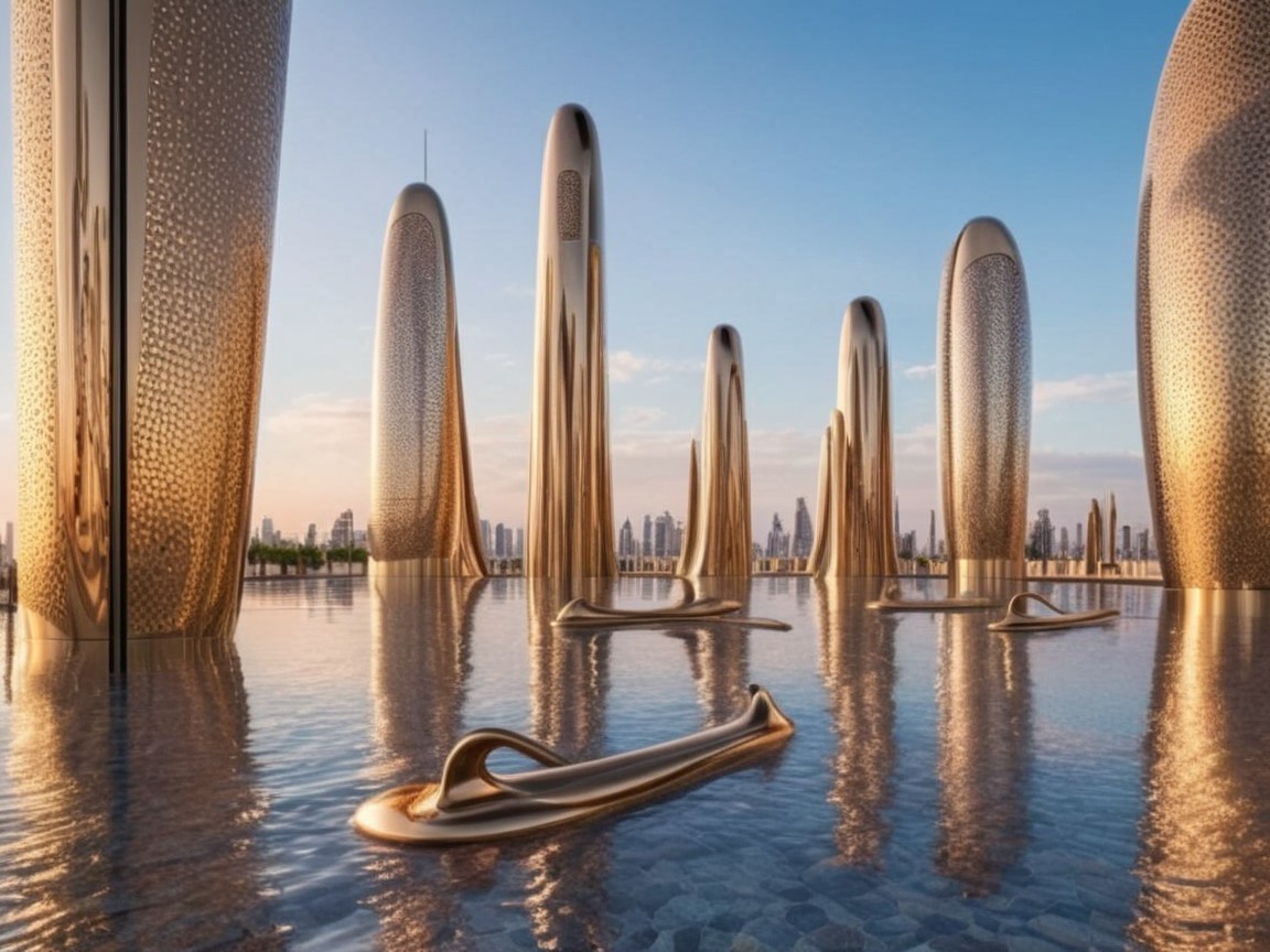 The image features golden cone-shaped sculptures rising from a tranquil water surface, reflecting a skyline of modern, towering buildings at sunset, creating a serene and futuristic atmosphere.