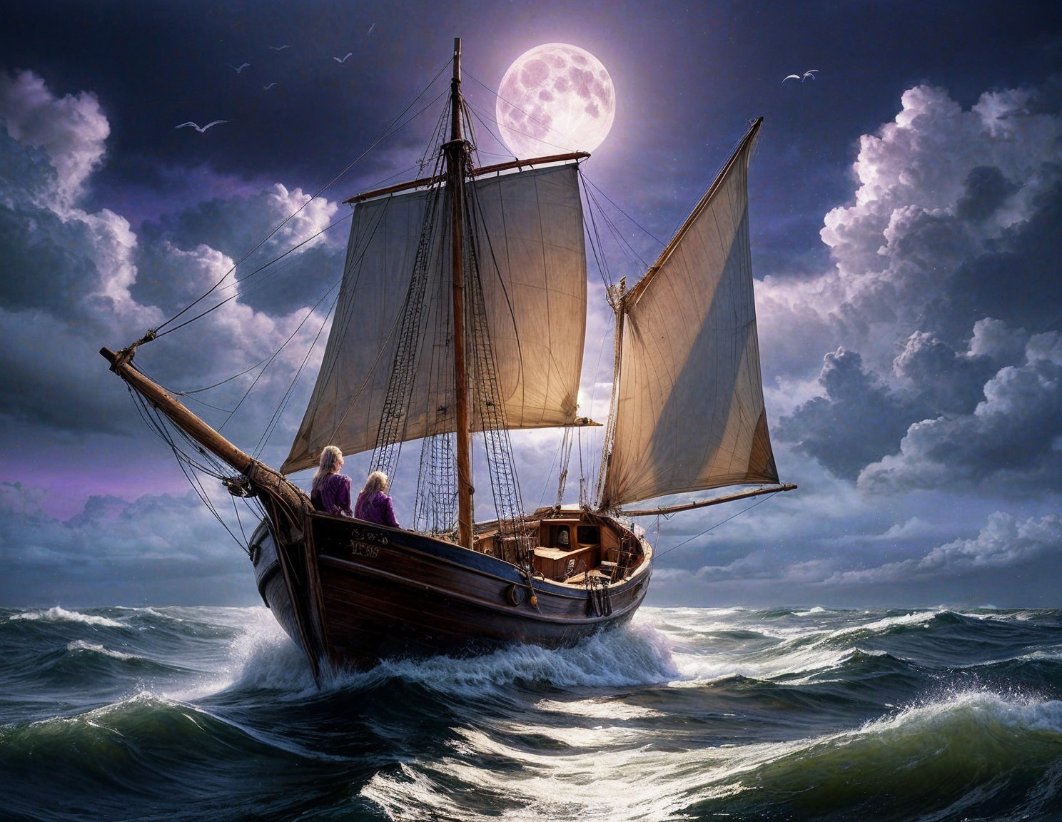 A sailing ship braves tumultuous seas under a moonlit sky with billowing clouds.