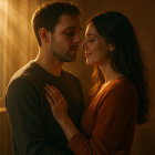 A warm and intimate scene depicting a young couple embracing in soft, diffused light filtering through a window.