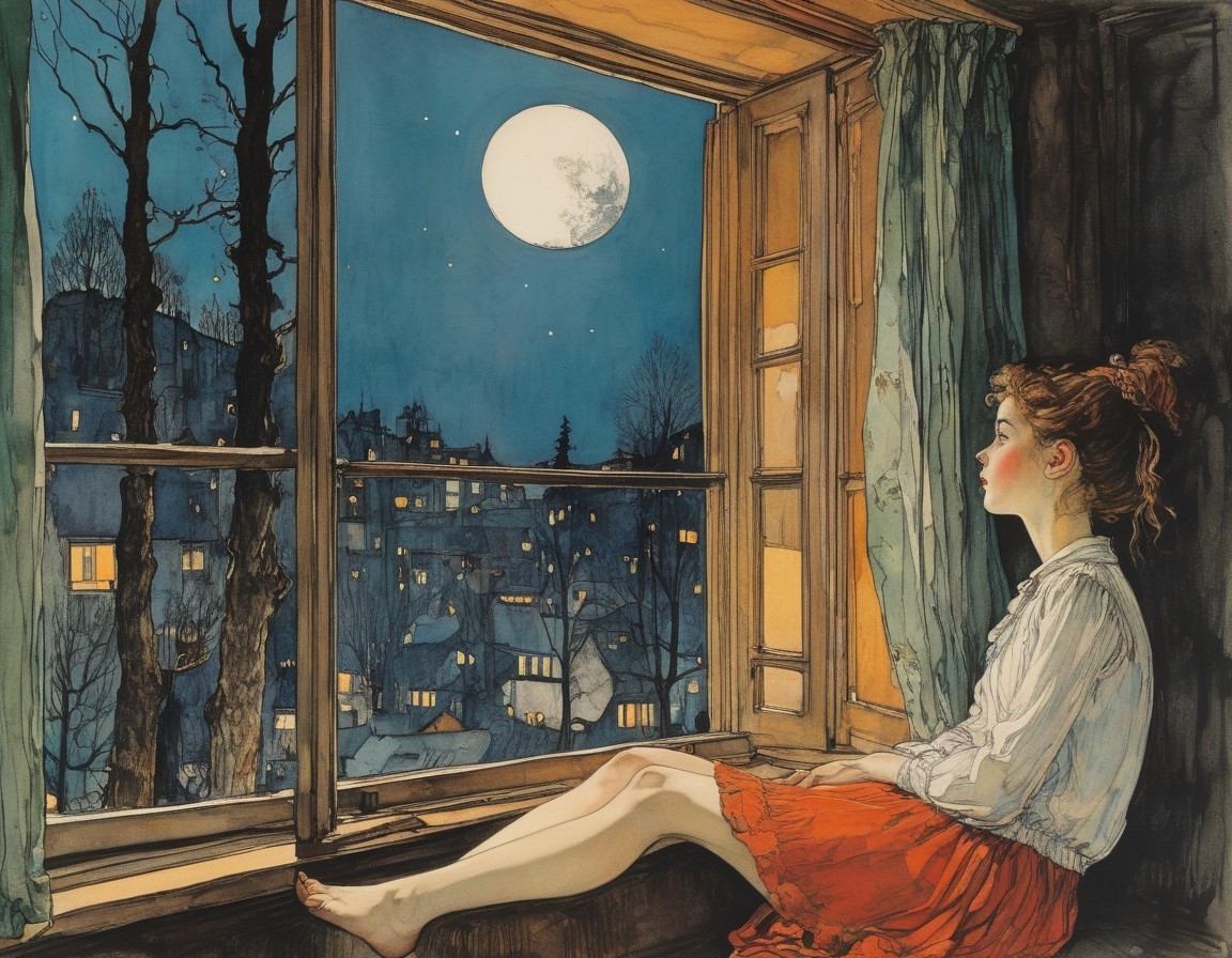 A woman sits by an open window, gazing at the full moon over a quaint village at night, with trees silhouetted against the sky.