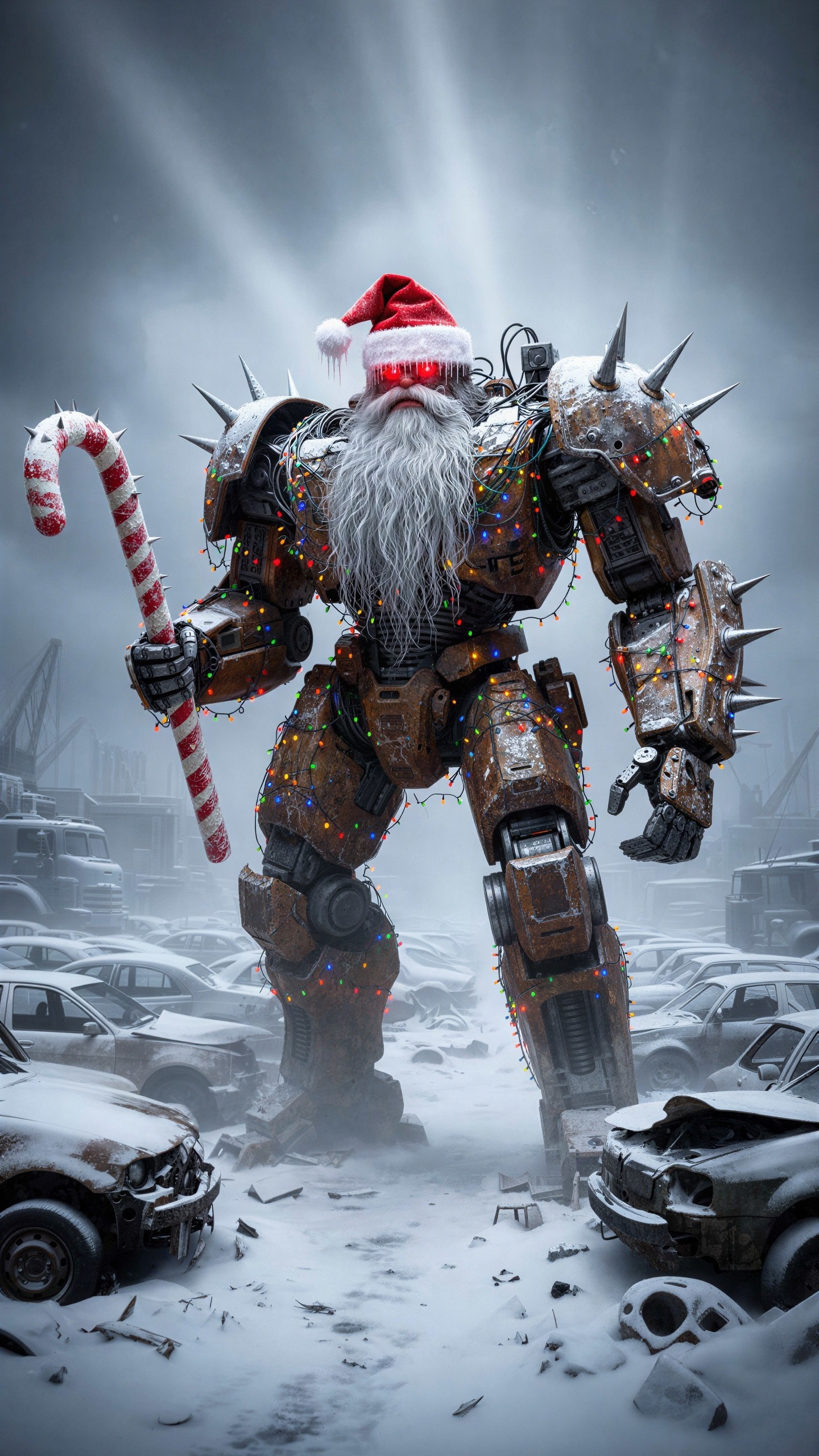 A large, rusty Santa cyborg robot stands in a snowy wasteland, among a junkyard of broken-down and snow-covered cars. The robot is adorned with Christmas lights, wearing a red Santa hat with icicles, and features a long white beard with red glowing eyes. It holds a giant