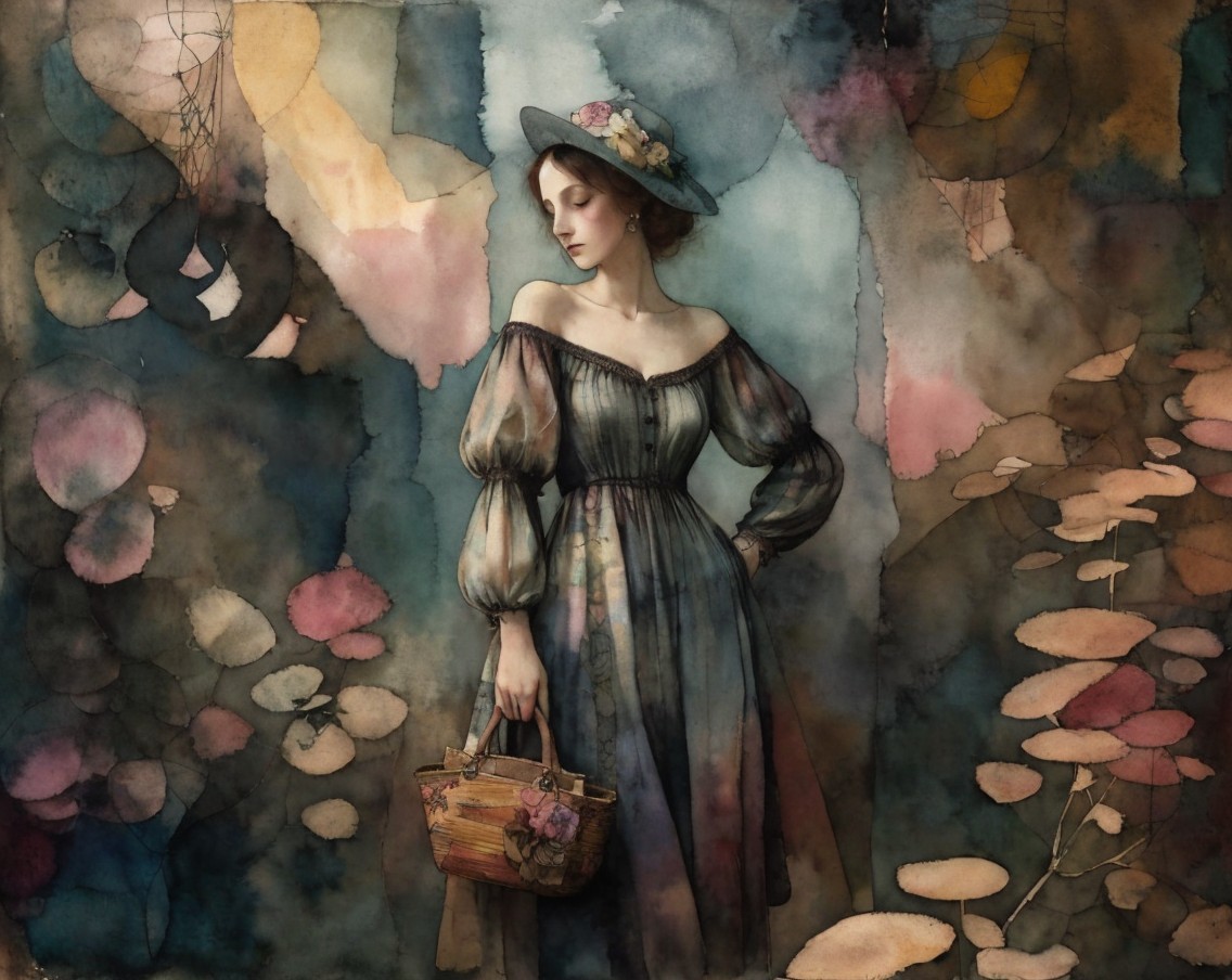 Patchwork fading tones of melancholy vintage summer nostalgia, soul search in portrait in ochre, patina of wine stains, mercury glass. Light and gossamer haze. art brut, moody, somber, desaturated colors, in the style of Paul Klee, Arthur Rackham, Banksy Stunning stylized, beautiful woman, intricate zentangle illustration, watercolor and ink painting, meticulous detail with fine pen strokes, intricate patterns, fractals, ochre and indigo colors, Amanda Clark, Catrin Welz-Stein, Zdzisław Beksiński, and Dee Nickerson