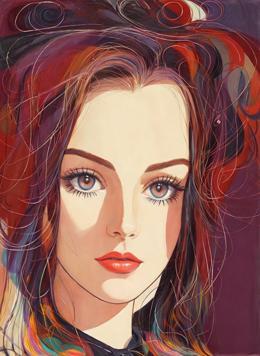 A colorful portrait of a woman with prominent eyes, wavy hair, and a vivid, abstract style.