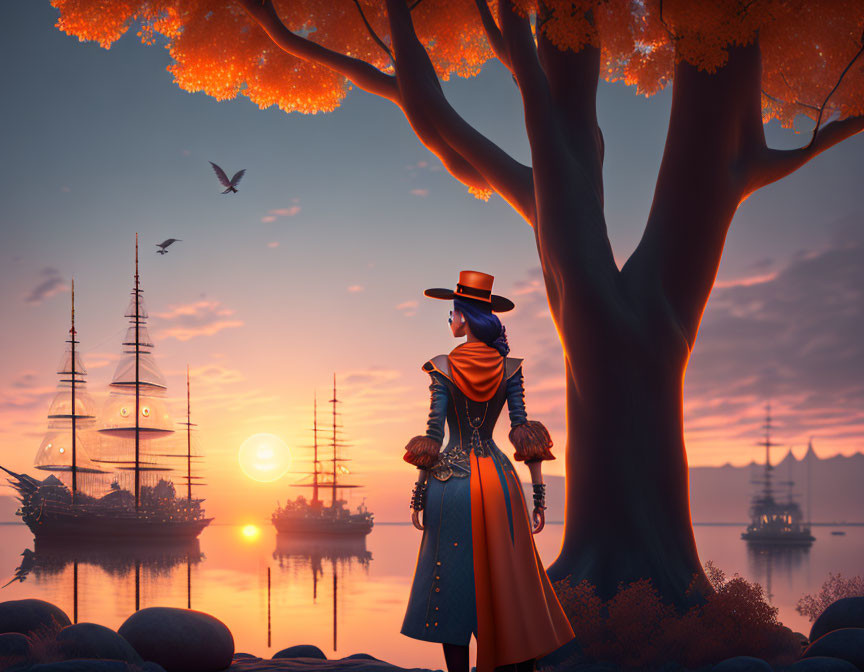 A beautiful woman in the foreground dressed in hipster and steampunk style. She is looking at a sunrise orange sky and nearby there is a tree. Photorealism.