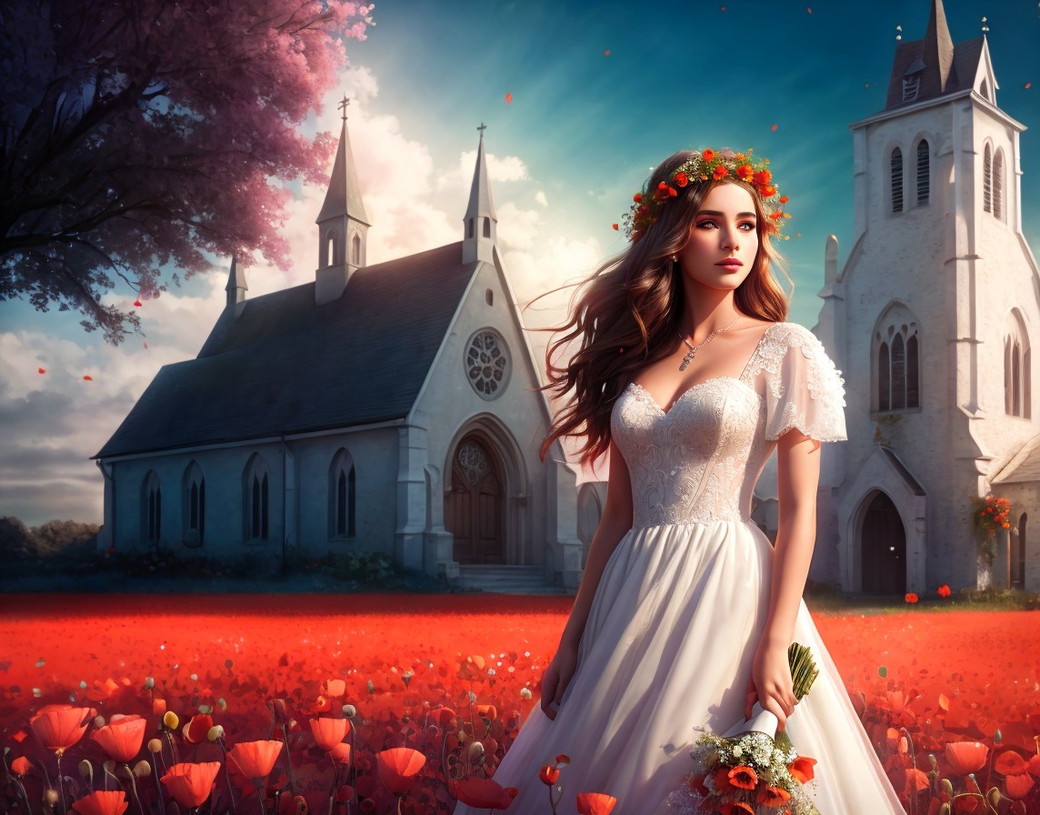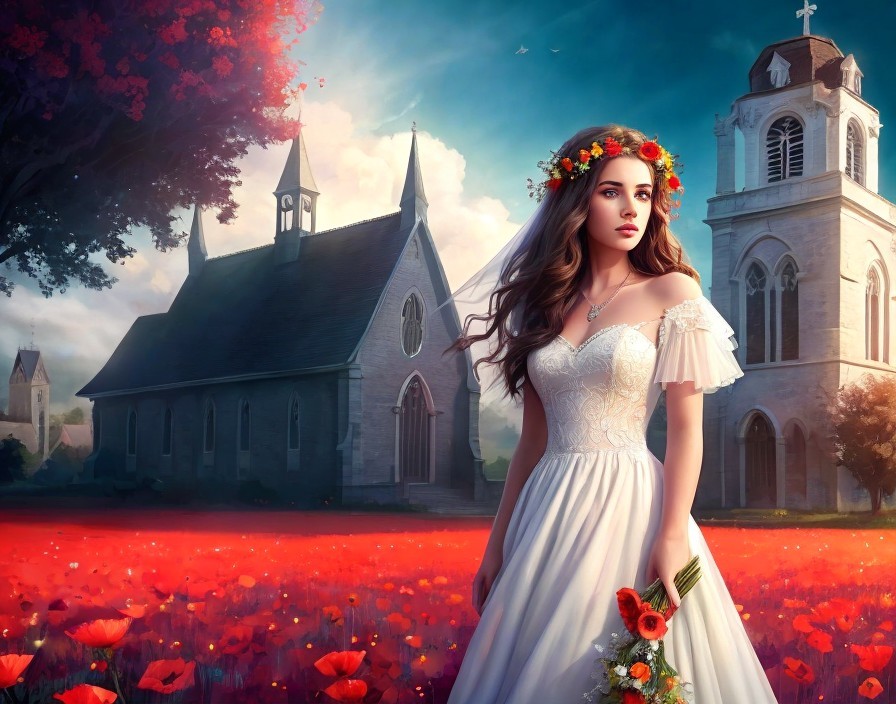 Bride in white dress with floral headpiece in poppy field near church under blue sky