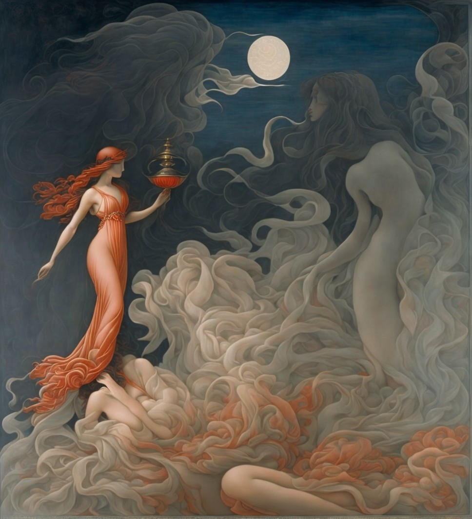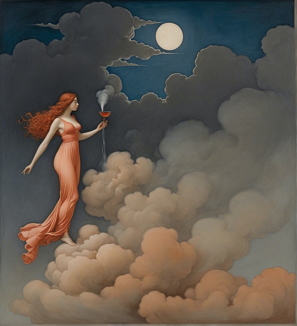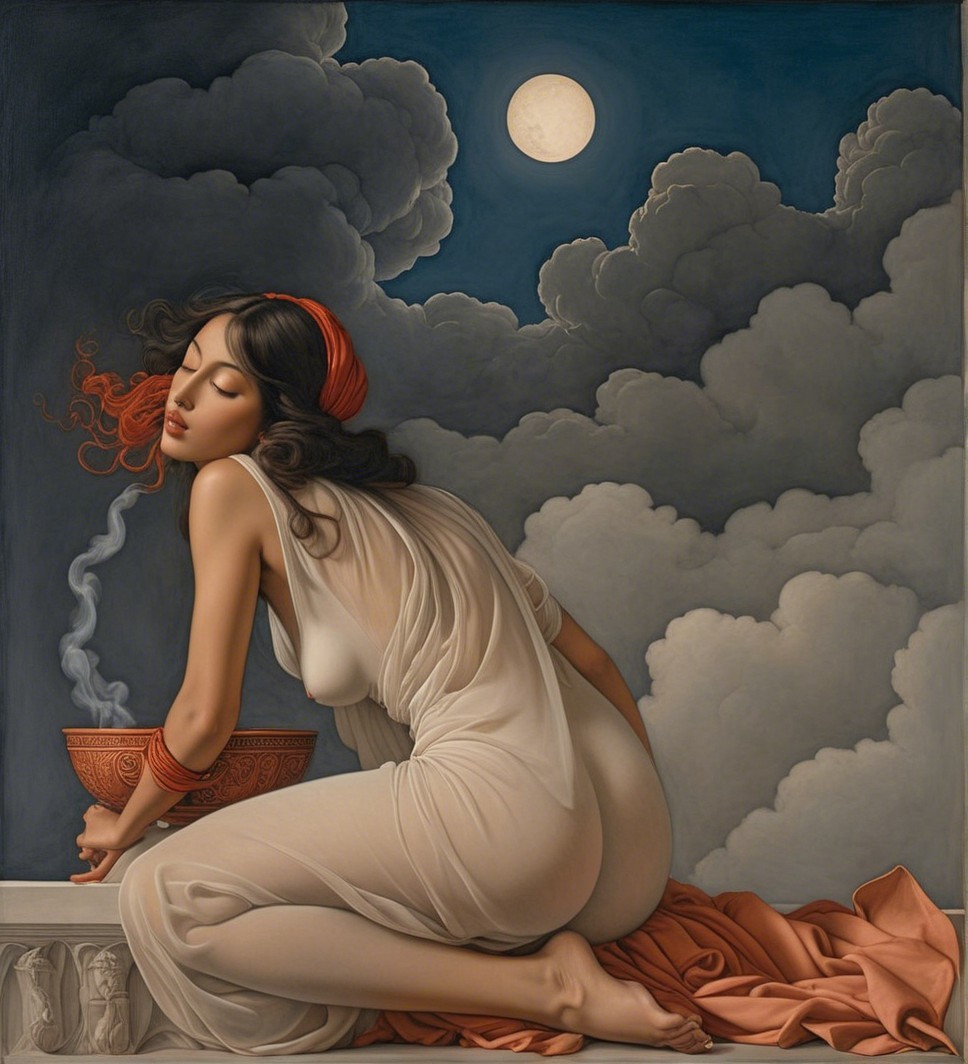 A serene woman in a flowing gown sits gracefully against a backdrop of starry night skies and a glowing moon, surrounded by soft, billowing clouds, evoking a dreamlike atmosphere.